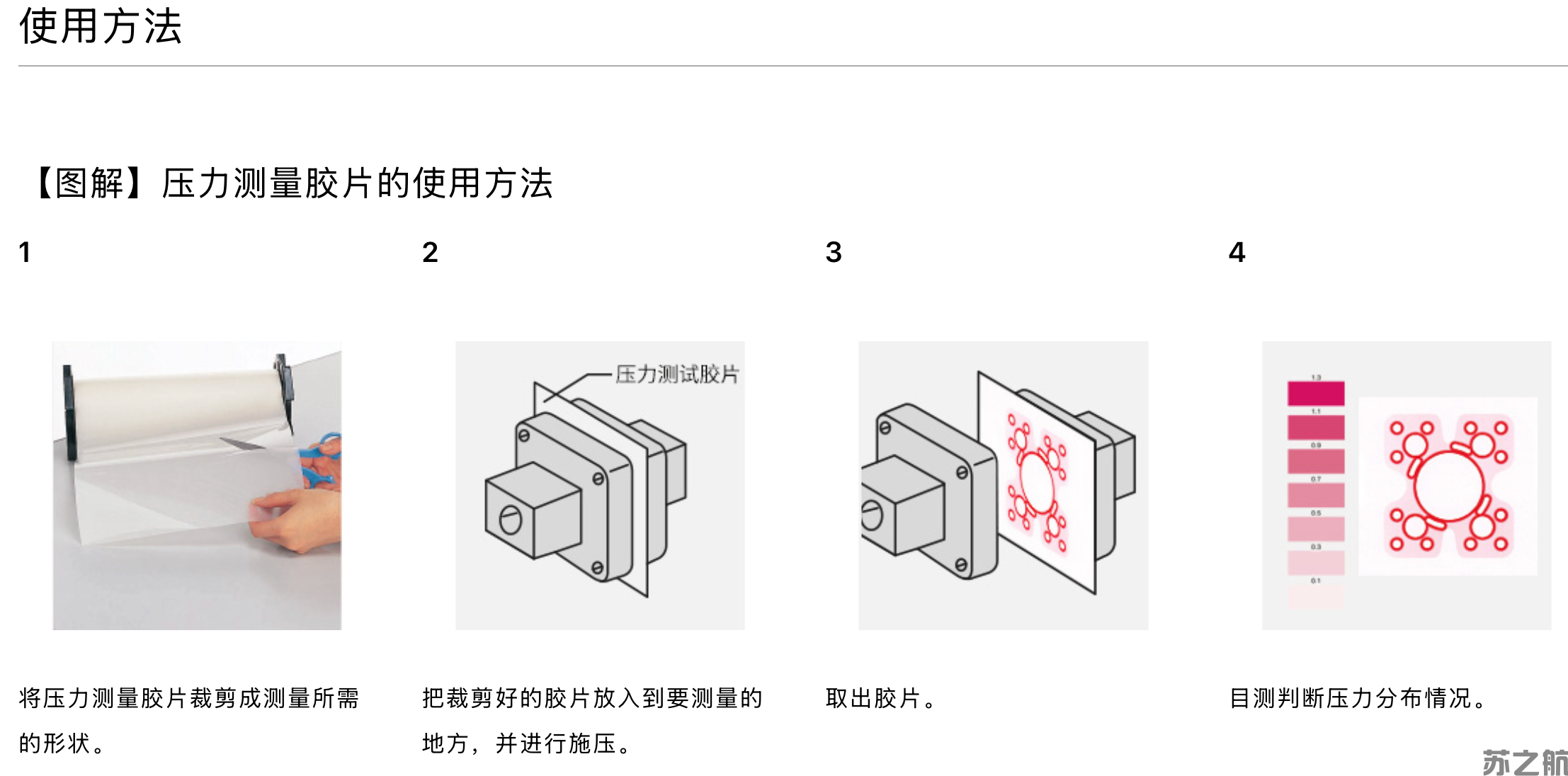 以看得见的方式呈现压力、表面压力和压力分布情况。压力测量胶片能够测量压力平衡、压力分布、压力大小。胶片整体设有压力测量感应,能够检查整个面的压力分布情况。胶片在受到压力时会变成红色,颜色浓度也会随着压力的大小而发生改变。覆盖压力范围为0.006~300MPa,此款压力测量胶片共有8款型号,9种类型